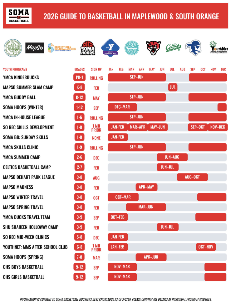 Created in partnership with SOMA Basketball Boosters, the 2026 Youth Basketball Program Calendar is your go-to place for all programs in South Orange and Maplewood.